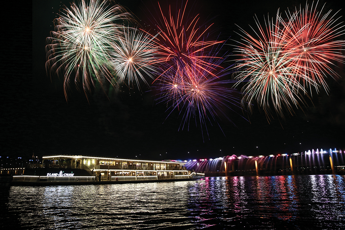 Enjoy a time of recreation and dinner on board the cruise ship, watching magic, dance, and dance performances, and culminate in a fireworks display outside the ship.